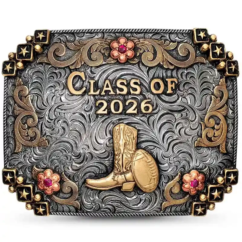 Our Aggie Class Belt Buckle is hand crafted on a German Silver base, featuring a rope edge and star detailed corners, Jeweler's Bronze scrolls with Copper flowers and red cubic zirconias, and Class of 2026 lettering with a centered cowboy boot with a football figure.