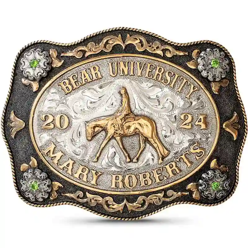 Root on your School with the Bears Class Belt Buckle. Crafted on a dual toned base with a hand engraved & a matted finish. This buckle is detailed with a Jeweler's Bronze rope edge, scrolls, lettering and German Silver flowers. Scroll down to customize this buckle with your choice of lettering, figure, and stone color.