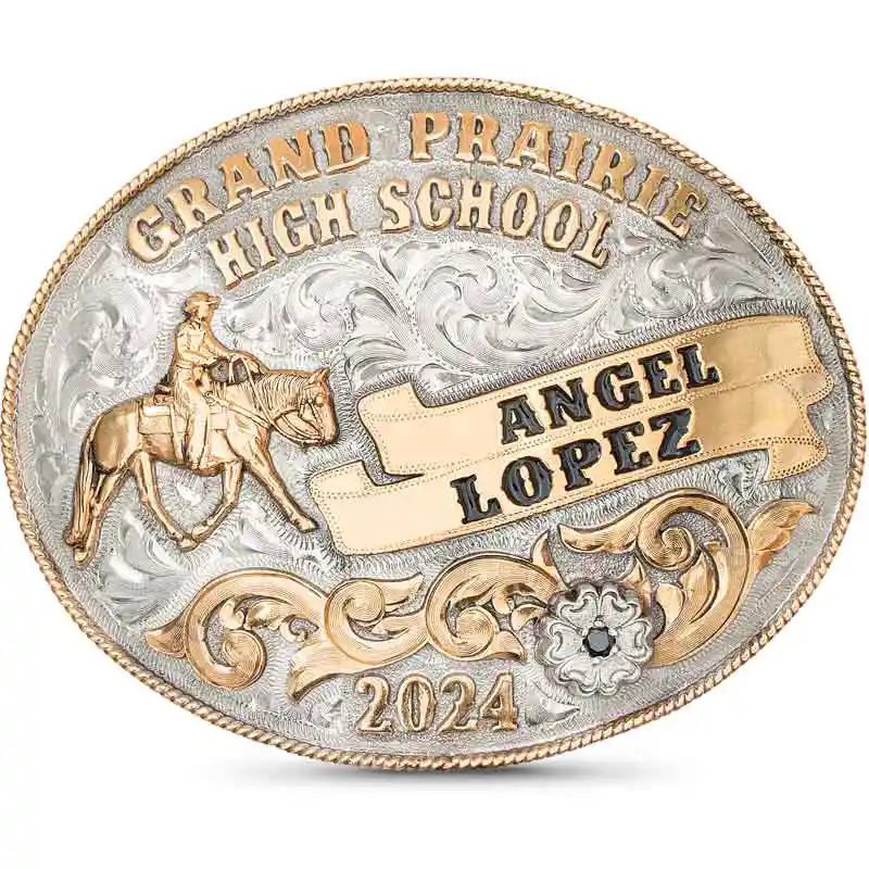 Our very traditional Prairie buckle has a German Silver base with a classic rope edge border and hand engraved jewelers bronze scroll work. The buckle features jewelers bronze banners and lettering, along with a beautifully hand engraved base. You may customize this buckle with your choice of letters, stone color, and figure.