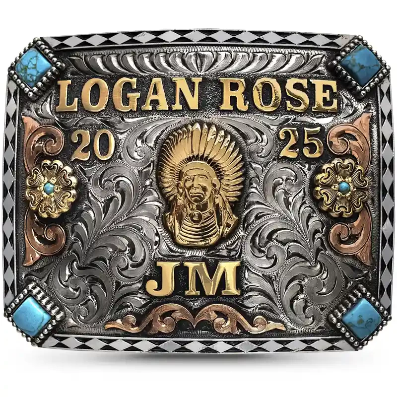 Our Rockdale Belt Buckle is hand crafted on a German Silver base, featuring 5 stones in the color of your choice, a diamond pattern edge, Copper scrolls and Jeweler's Bronze lettering. Customize your buckle to proudly reflect your well-deserved achievements down below!