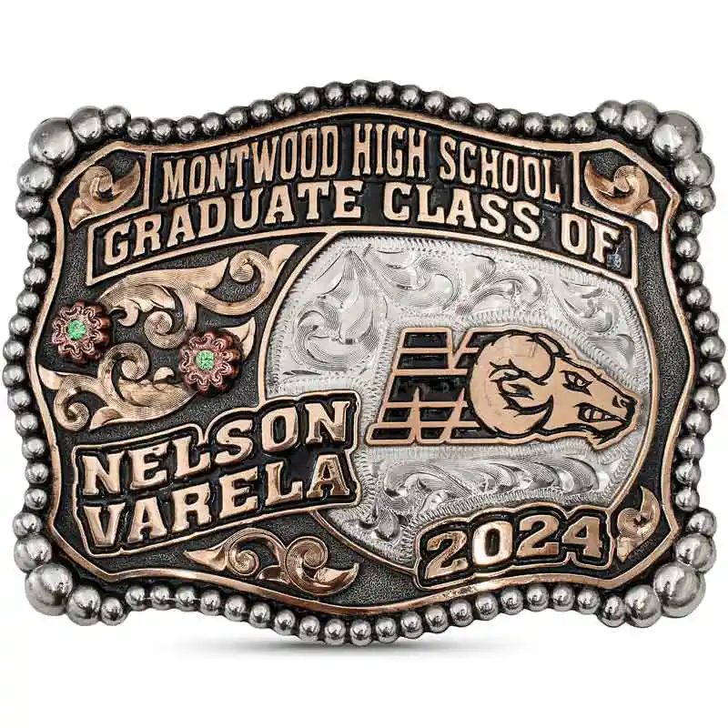 Wear a Classic Style Western Buckle to Graduation! The Tyler Class Buckle is crafted on a German Silver base with a matted finish and hand-engraved scrolls. Detailed with German Silver beaded edges, Jewelers Bronze scrolls and copper flowers.